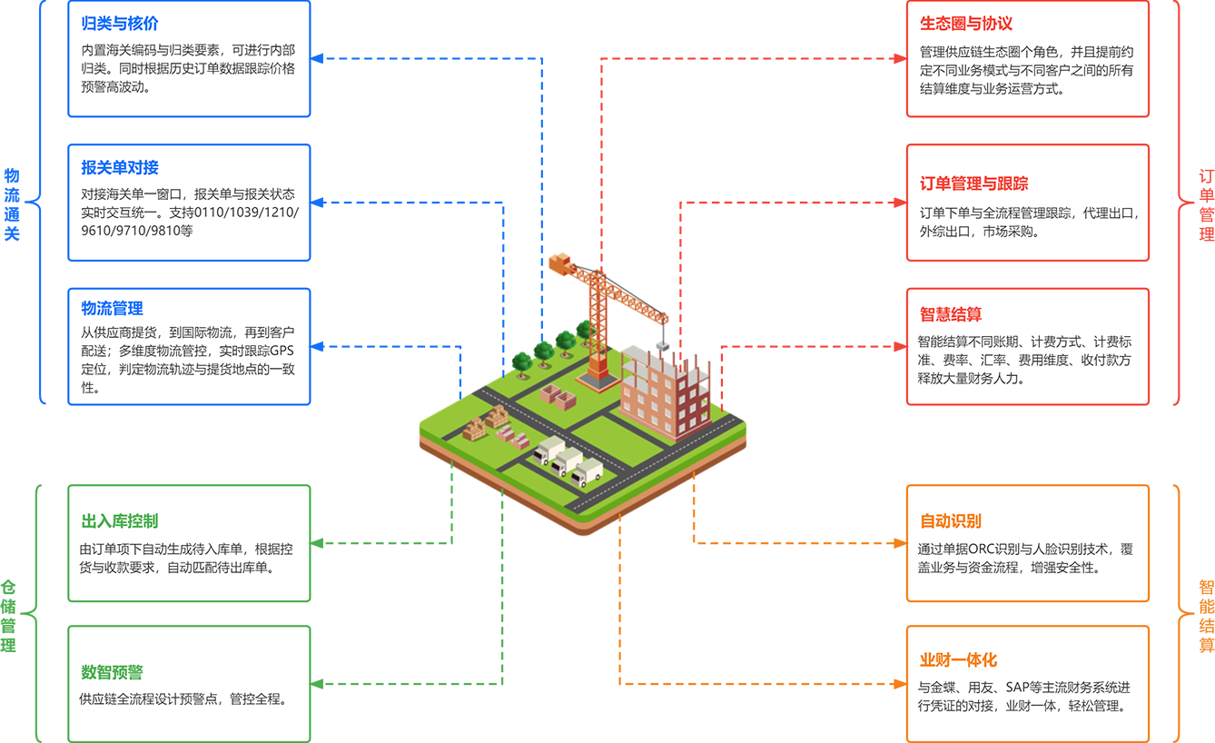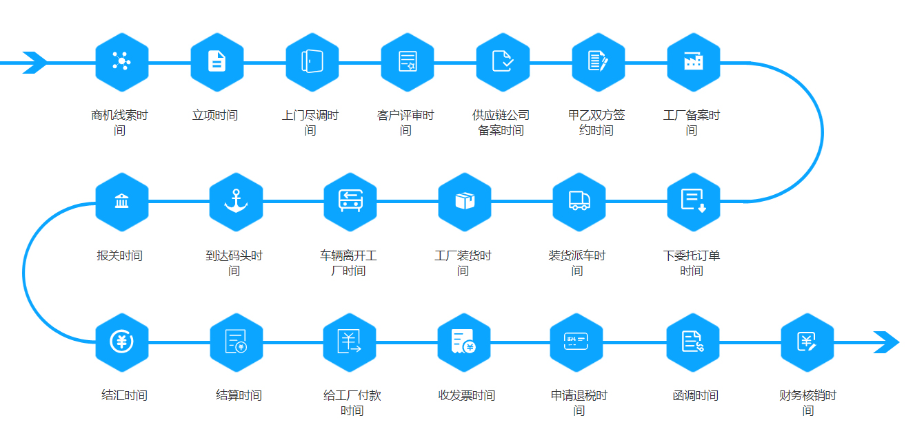 選擇業(yè)務(wù)流程類型,如自營進口、代理出口等;在線下達供應(yīng)鏈委托單后,確定是否墊資、控貨、管控物流等;安排計劃。