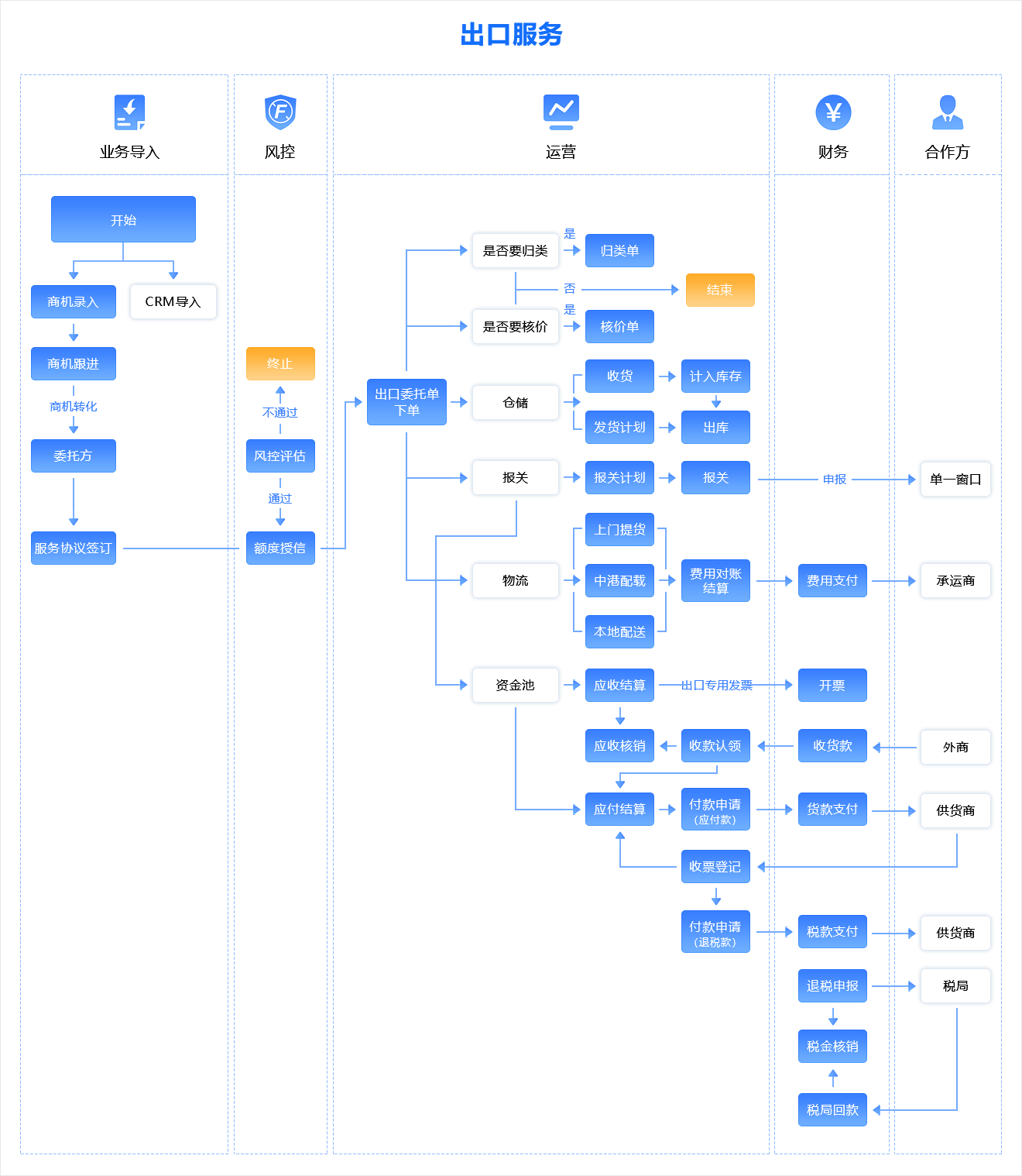 支持多方協(xié)同互動,包括上游、下游、第三方服務(wù)商等;同時可通過API接口平臺對 接單一窗口、稅控系統(tǒng)、財務(wù)系統(tǒng)、外匯牌價、電子簽約、大數(shù)據(jù)、銀企直聯(lián)等。