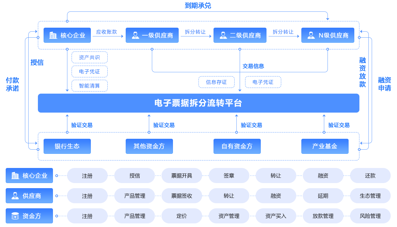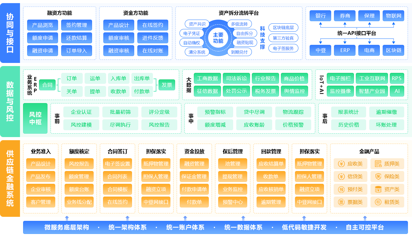 管理應(yīng)收類、預(yù)付類、存貨類等供應(yīng)鏈金融流程,包含產(chǎn)品設(shè)計(jì)與發(fā)布,融資放款、利息結(jié)算、融資回款等功能。
